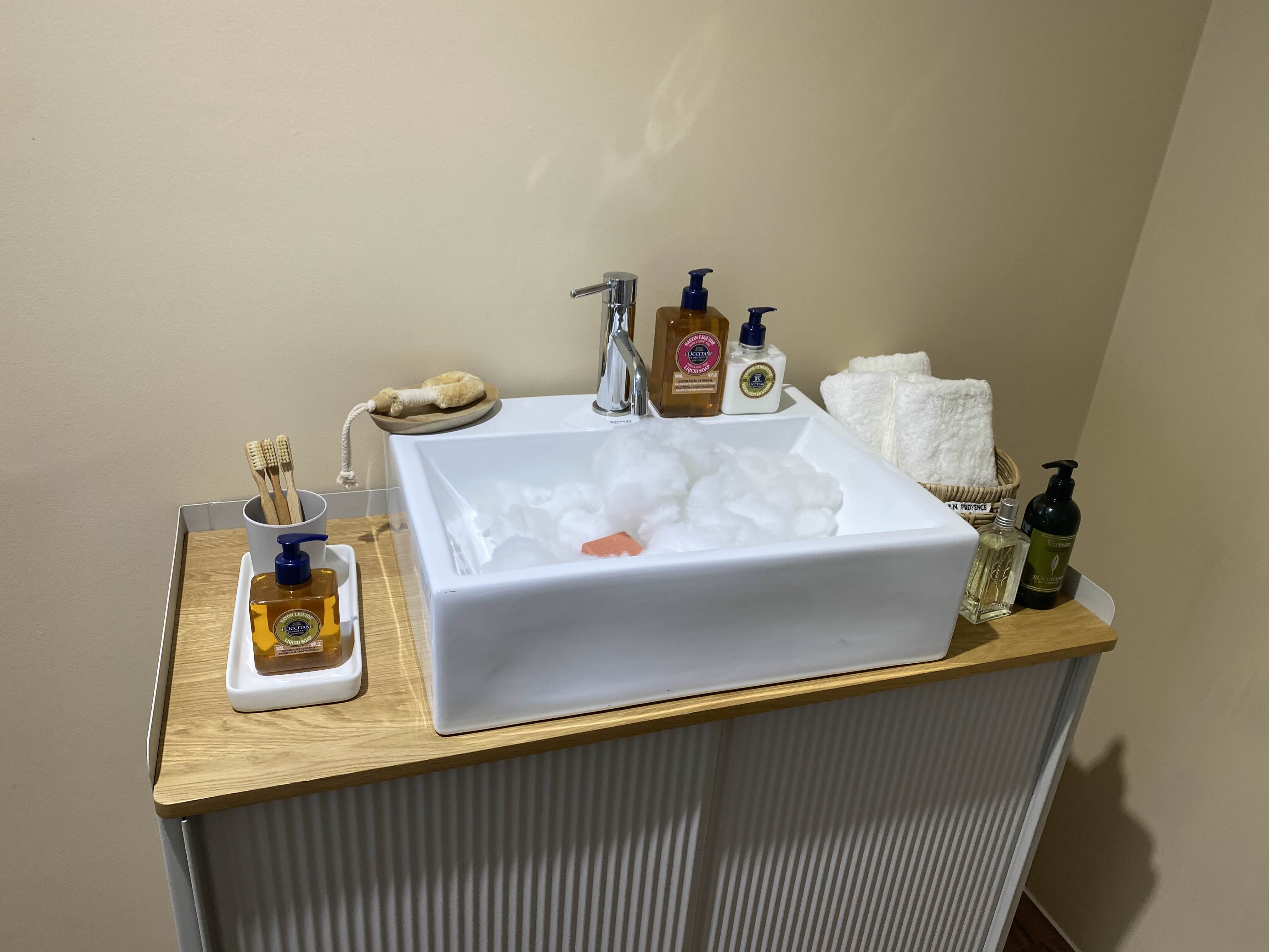 저렇게 다양한 샤워젤, 핸드솝, 샤워오일, 샴푸, 컨디셔너 등등을 담아서